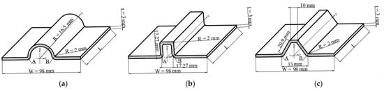 The geometries of the different cross-sectioned stiffeners (Type I–III) are shown in Figure 1. The thickness t of specimens is 3 mm, L (the length of specimens) is from 145 mm to 220 mm, w represents the width (98 mm), and R represents the corner radius (2 mm). The arc length (l) from point A to B is 33 mm for the semicircular and trapeziform cross-sections and 17.27 mm for the specimens in the rectangular cross-section. Then, the different cross-sectioned specimens were compressed at the axial direction using a universal testing machine (E44, MTS Systems Co., Eden Prairie, MN, USA). The loading velocity for the compression test was set as 12 mm/min loaded on the ends of the specimens. In order to guarantee reliable experimental data, five compression tests were repeated for the same designed cross-section; in total, 45 samples (3 cross-section types*3 samples of different lengths for each cross-section type*5 repetitions for each design) were tested. Then, the peak force (Fmax) and the displacement (Smax) at the instant of Fmax were used as the evaluation index in investigating the mechanical properties of LGFR-PP stiffeners with different cross-sections or lengths under compression. Specifically, the greater Fmax reflects the greater buckling resistance of the design, and the smaller Smax means better rigidity.
