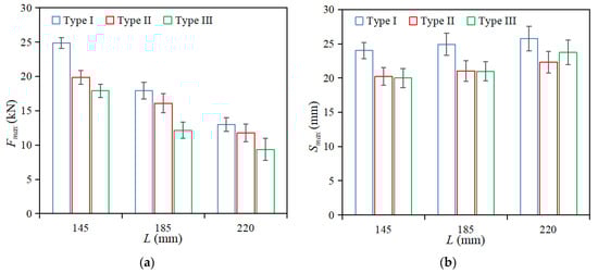 The average and standard deviation of Fmax (a) and Smax (b) for the specimens with different cross-sections and lengths, calculated from the experimental data.