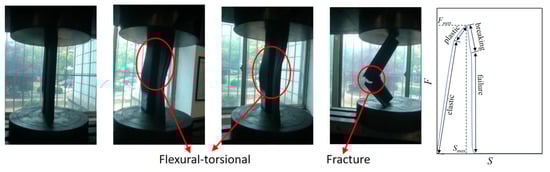 The typical deformation process, failure behavior, and force–displacement relationship of the specimens under compression (S: displacement, F: force, Fmax: peak force, Smax: displacement at the instant of Fmax).