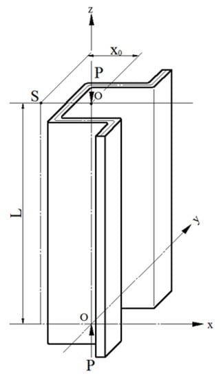 In this section, the instability mode of LGFR-PP stiffeners subjected to axial compression is studied based on the elasticity stability theory for uniform cross-sectioned open thin-walled bars in metal materials. As shown in Figure 4, it is supposed that L is the length of a specimen, A is the area of the cross-section, O is the section centroid, x and y represent the principal inertia axes of the cross-section, and z is the centroidal axis. S represents the flexural center of the cross-section and the corresponding coordinate is (xc, yc). When the axial pressure P is increased to the critical value Pcr, the twisting or bending of the specimen may take place, which leads to a loss of stability for the specimen. Assume that the specimen is in a neutral equilibrium state, and its independent displacement components include the displacements and of the bending center S in the axes x and y direction and the torsion angle of the cross-section around the bending center. The and coinciding with the forward axis are positive. The sign of is determined by the right-hand screw rule. The , , and are functions of z.