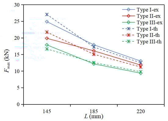 Based on the parameters in Table 1 and Equation (16), the Fmax values of all specimens tested in the experimental study were calculated and compared with the average value of the experimental data in Figure 5. Generally, the estimated results were close to those of the experimental average values, with a maximum relative error within 10%.