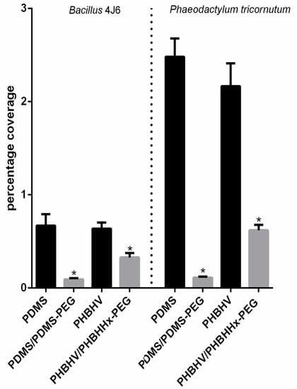 Figure 2. Percentage coverage of Bacillus sp. 4J6 bacteria (t = 2 h; initial concentration = 108 cells/mL) and and Phaeodactylum tricornutum (t = 48 h; initial concentration = 105 cells/mL), on PHBHV and PDMS coatings with or without PEG in its copolymer form (PHBHHx-PEG or PDMS-PEG) (n = 30). * indicates significant difference from the coatings without PEG (Adapted with permission from Ref. [62]. 2021 Taylor & Francis).