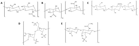Figure 3. Main polysaccharides used in anti-adhesive coatings. (A) Hyaluronic acid, (B) alginate, (C) chitosan, (D) heparin, and (E) chondroitin.
