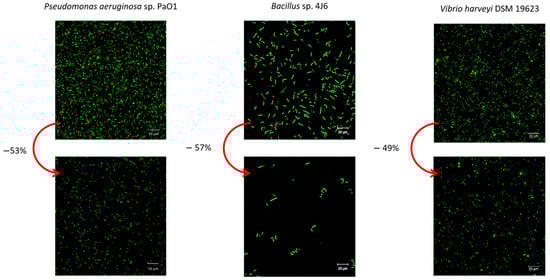 Figure 7. Prevention of bacterial adhesion (P. aeruginosa, Bacillus sp., and V. harveyi) with hyaluronan-like EPS in static conditions. Confocal laser scanning microscopy observations of the bacterial adhesion with syto9® after 2 h with addition of 125 µg/mL hyaluronan-like EPS at 20 °C. The biomasses of the biofilms in flow cells were analyzed using COMSTAT software and biofilm percentages (%) were determined compared to the control (Adapted with permission from Ref. [132]. 2022 MDPI ).