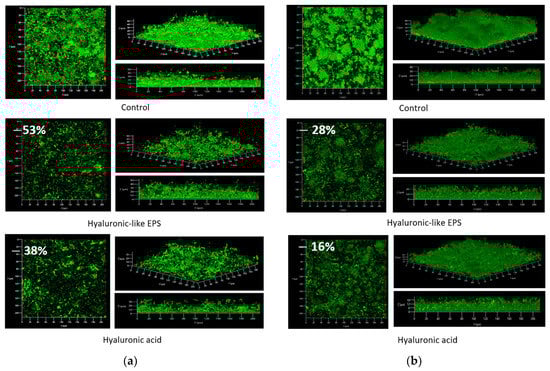 Figure 8. Prevention (a) and disruption (b) of V. harveyi biofilms (syto9®) with hyaluronan-like EPS or HA in a flow cell. Flow cells irrigated by a medium were inoculated at 28 °C for 24 h with and without (control) 125 µg/mL of hyaluronan-like EPS or HA. Images and structures of biofilms in flow cells were detected by CLSM. The biomasses of biofilms in flow cells were analyzed using COMSTAT software and biofilm percentages (%) were determined compared to the control (Adapted with permission from Ref. [132]. 2022 MDPI).
