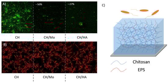 Figure 9. Confocal laser microscopy observations of CH, CH/Mo, and CH/HA coatings and the adhesion of (A) V. harveyi at a flow of at 1 mL/min at 108 cells/mL for 4 h in ASW at 20 °C, values represent the percentage of adhesion inhibition (B) C. closterium at 105 cells/mL in static conditions for 72 h in ASW medium complemented with F/2 silica nutrients at 20 °C, (C) schematic representation of anti-adhesive coatings. Bacteria were stained with Syto9®.