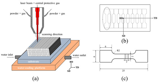 Figure 1a depicts the schematic view of the Directed Energy Deposition (DED) process. To prepare the Laser additive coating with a thickness of 2 mm, an FL-1500 1.5 kW fiber laser was employed along with a synchronous powder-feeding and water-cooling system. To ensure the coatings were free from defects such as pores and microcracks, optimization of processing parameters was carried out as follows: a laser power of 650 W, spot diameter of 1.2 mm, traverse speed of 550 mm/min, energy density of 390 W/mm2, overlap rate of 50%, and a powder delivery rate of 3.4 g/min. High-purity argon (5 Ar, 99.999%) was used as both a carrier and shielding gas at a flow rate of 10 L/min. After melting layers were deposited, the Ni-based alloy coatings with a dimension of 40 mm × 30 mm × 3 mm were fabricated successfully. Figure 1b represents the schematic view of the Sampling method. The specimen surface was smoothed and polished after preparation, and wire cutting was carried out based on the dimensions presented in Figure 1c. Preliminary testing demonstrated that the surface of all sample groups did not exhibit visible cracks.