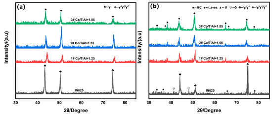 Figure 2 shows the XRD spectra of IN625 and three distinct IN625 coatings with Co/TiAl (#1, #2, and #3) before and after heat treatment. It is evident from Figure 2a that the diffraction peaks of the Co, Al, and Ti-coated specimens in their as-deposited state are very similar to those of IN625. This is because the γ phase, γ′ phase, and γ″ phase are all mutually coherent and have similar lattice parameters, making it difficult to distinguish them. Moreover, it is difficult to observe the Laves phase and carbide diffraction peaks during testing due to the small quantity and volume fraction of precipitation phases in the unheated-treated coatings [31]. The main precipitated phase of IN625 is the matrix γ phase, which is consistent with the results of Li [32] and Ding [33] and the research of others on the fact that its microstructure is mainly the martensitic γ phase matrix at room temperature. After heat treatment at 900 °C × 10 h + 850 °C × 2 h, the coatings of IN625 and those added with Co, Al, and Ti elements in Figure 2b exhibit the diffraction peaks of Laves phase and carbide. The IN625 coating has a diffraction peak of the δ phase, which is due to the γ″ phase lattice distortion caused by high temperature (850 °C) aging, which promotes the transformation of the metastable γ″ phase into the δ phase. This is similar to the research results of Mathew et al. [34] and Di et al. [35]. The coatings added with Co, Al, and Ti elements showed the diffraction peak of the σ phase after heat treatment (Figure 2b), which is due to the formation of γ + γ′ eutectic and the enrichment of Cr, Mo, and Co elements around them during aging. This promotes the formation of the σ phase in the coatings.