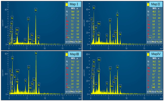 The microstructure and chemical composition of IN625 and three distinct Co/TiAl-coated IN625 specimens (#1, #2, and #3) were observed and analyzed through SEM and EDS. As shown in Figure 3, compared to the original IN625 coating, the addition of Ti, Al, and Co elements in the coatings results in a significant increase in the number of precipitated phases, which are mainly white spherical or plate-like precipitates. The number of precipitated phases is significantly higher for the coating with a Co/TiAl ratio of 1.55 compared to coatings with ratios of 1.25 and 1.85. EDS mapping revealed that the Nb element is significantly segregated at the grain boundaries of the coatings. The Ti element also exhibits notable segregation at the grain boundaries of #1, #2, and #3 coatings, while the Al element is only segregated in the white precipitates with uniform distribution in other areas. The segregation behavior of these elements is consistent with that observed in other nickel-based high-temperature alloys manufactured using laser additive techniques and conventionally cast alloys, as reported in previous studies [36,37]. The energy spectrum analysis of regions I, II, III, and IV in Figure 3 is presented in Figure 4. The composition analysis of region I indicates that it primarily consists of Ni, Cr, Mo, and Nb elements with a similar elemental content to the alloy powder used for preparing the coating. Thus, region I in Figure 3a can be considered as the γ-base phase. The energy spectrum analysis of regions II, III, and IV reveals substantial amounts of Ni, Ti, Al, Nb, and Co, corresponding to the formation of intermetallic compounds such as γ′-Ni3Al, Ni3(Al,Ti), and (Ni,Co)3(Al,Ti) in the coatings. The γ″ phase primarily forms due to the [Ni3(Nb,Al,Ti)] intermetallic compound. Accordingly, the white spherical or plate-shaped precipitates observed at regions II, III, and IV in Figure 3 correspond to the γ′ and γ″ phases, respectively. This observation is consistent with the findings of Zhou et al. [38].