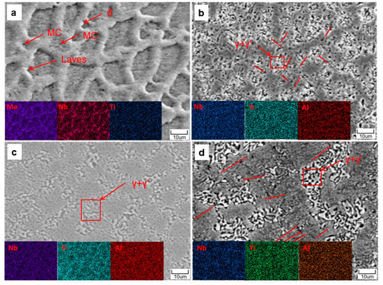 SEM and EDS analysis of the as-heat-treated IN625 coating and the three Co/TiAl modified IN625 coatings (#1, #2, and #3) are presented in Figure 5. The SEM image in Figure 5a reveals noticeable grain boundary precipitation and coarsening in the as-heat-treated IN625 coating. Further EDS scanning analysis confirms substantial segregation of Mo and Nb elements at the grain boundaries. This is due to the relatively stable precipitation of the γ′ phase within the grain during the aging process; as the aging time is increased, gradual precipitation and growth of the γ″ phase followed by transformation into the δ phase occurs. Furthermore, it is noticeable that a significant amount of Laves phases and carbides accumulate at the grain boundaries [35,36]. Figure 5b–d demonstrate that the heat-treated coatings with Co/TiAl ratios of 1.25, 1.55, and 1.85 experience lower levels of element segregation of Nb, Ti, and Al, as well as a more uniform distribution. This phenomenon can be explained by the effect of heat treatment, which reduces the element segregation of the alloy, leading to a more uniform microstructure distribution and increased refinement of the γ′ and γ″ phases. Furthermore, the heat treatment dissolves some brittle phases and carbides at the grain boundaries [37,38]. It can be clearly observed from Figure 5b–d that the coatings with added Co, Al, and Ti elements feature the formation of numerous irregularly shaped γ + γ′ eutectic structures. When the Co/TiAl ratio is either 1.25 or 1.85, a noticeable amount of needle-shaped σ phase precipitates around the γ + γ′ eutectic structures (indicated by red arrows in Figure 5). It is also observed that the coating with Co/TiAl ratio of 1.85 has higher quantity and larger volume of the σ phase precipitates. However, no conspicuous precipitation of the σ phase is observed when the Co/TiAl ratio is 1.55.