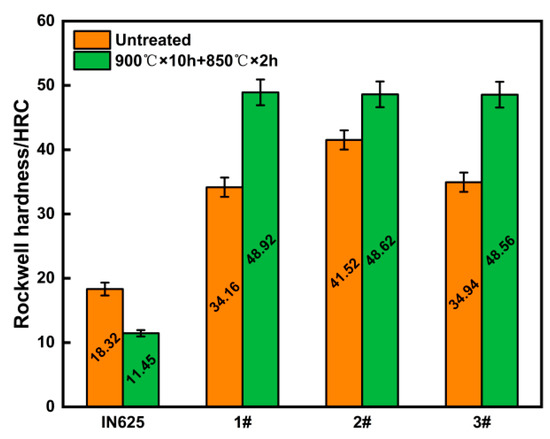 The variations in hardness values of the IN625 coating and three Co/TiAl modified IN625 coatings, before and after heat treatment, are illustrated in Figure 6. The data presented in Figure 6 indicates that the initial hardness value of the IN625 coating is 18.32 HRC, which significantly increases with the addition of Ti, Al, and Co elements in the as-received coatings. It is worth noting that the highest hardness value (41.52 HRC) is achieved when the Co/TiAl ratio is 1.55, due to the considerable precipitation of the γ′ phase that significantly contributes to the increase in hardness. This is consistent with the results reported in the study conducted by Tang et al. [39]. After heat treatment, the hardness of the IN625 coating decreased significantly as a result of the precipitation of the δ-phase at 800 °C and continuously coarsening or dissolving with increasing temperature, leading to a decrease in the hardness of the alloy [40]. In addition, carbides and Laves phases that precipitate and grow at grain boundaries are another reason for the decrease in the hardness of the IN625 coatings. Contrary to the IN625 coating, the three Co/TiAl modified IN625 coatings reveal a noticeable increase in hardness after heat treatment. The increase in hardness is mainly caused by grain strengthening arising from the increase in the number of refinements of the γ′ phase in the matrix as well as the precipitation strengthening arising from the increased precipitation of the σ phase after the aging heat treatment. This result agrees with previous studies on this topic conducted by Xu et al. [36] and Kishore et al. [41].