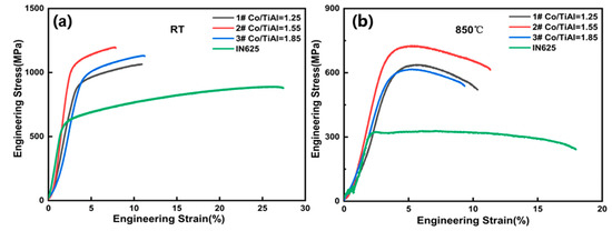 (2) Excellent mechanical properties. In comparison to the IN625 coating, the incorporation of Co, Ti, and Al additives in the IN 625 laser cladding layer results in a substantial enhancement in coating hardness and room temperature strength, albeit accompanied with a steep reduction in ductility. At a Co/TiAl ratio of 1.55, the coating exhibits its highest yield strength and hardness values (1050 MPa, 41.52 HRC) yet records an elongation of only 8.1%. The hardness of the IN625 coating reduces upon heat treatment (900 °C × 10 h + 850 °C × 2 h). Conversely, the integration of Co, Ti, and Al into the IN 625 laser cladding layer leads to a marked surge in hardness. As the Co/TiAl ratio rises, the yield strength and elongation of the IN 625 laser cladding layer containing Co, Ti, and Al additives initially increase, but they both ultimately decline at a temperature of 850 °C. Notably, the IN625 coating with a Co/TiAl ratio of 1.55 exhibits excellent high-temperature (850 °C) mechanical properties without crack defects, exhibiting a superior combination of hardness, tensile strength, yield strength, and elongation rate, measuring 48.62 HRC, 665 MPa, and 11.3%, respectively.