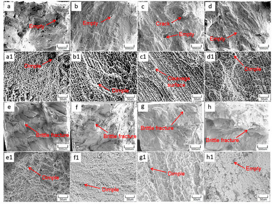 The fracture surfaces of IN625 and various Co/TiAl IN625 (1#, 2#, and 3#) laser additive samples under ambient and 850 °C high-temperature conditions are presented in Figure 8. Figure 8a–d,(a1–d1) depict the tensile fracture surfaces of IN625, 1#, 2#, and 3# specimens under ambient temperature conditions, whereas Figure 8e–h,(e1–h1) illustrate the tensile fracture surfaces of the same specimens under high-temperature (850 °C) conditions. When subjected to ambient temperature tensile conditions, the fracture surface of IN625 specimens shows transgranular fracture and numerous dimples, which indicate ductile failure (shown in Figure 8(a1–e1)). In contrast, the fracture mode transitions to intergranular fracture under 850 °C tensile conditions, with a reduced amount of dimples compared to the room temperature case. This phenomenon is attributed to the gradual precipitation and coarsening of the δ phase along with significant carbide clustering at grain boundaries during both thermal processing and high-temperature tensile testing, which inevitably leads to decreased plasticity. It can be observed from Figure 8c. that cracks appear at the tensile fracture, and the reason for the formation may be that the γ′′ phase and carbide hinder the dislocation movement during the plastic deformation process, resulting in nearby stress concentration, and microcracks will occur in the stress concentration area of the alloy when the stress concentration exceeds the tensile strength [43,44]. This is also an important reason why its elongation is lower than that of other coatings. Figure 8(b1–d1) reveals that samples containing Ti, Al, and Co also display apparent transgranular fractures, which are attributed to the precipitation of γ′ and γ″ phases at the grain boundaries, leading to a stronger boundary strength than that of the interior grains, thereby promoting crack propagation from the grains. Figure 8(b1–d1) exhibit a small amount of dimples, but there are no visible dimples in Figure 8(c1), instead showing distinct cleavage surfaces, which indicates brittle fracture. Upon thermal processing, the tensile fracture surface of the specimens shifts from transgranular fracture at ambient temperature to intergranular fracture when exposed to elevated temperatures (depicted in Figure 8(f1–h1)), attributable to the formation of the σ phase at grain boundaries that are weaker than the interior grains, favoring crack propagation along the grain boundaries. As evidenced by the fracture morphology in Figure 8(g1), the grains are observed to undergo elongation, owing to the formation of the plastic γ + γ′ eutectic phase that is prone to elongation at high temperatures, resulting in a ductile fracture mode. Figure 8(h1) shows a considerable amount of voids, resulting from the substantial and coarse precipitation of the σ phase, resulting in cavity generation upon tensile deformation and compromising its plasticity. In addition, it is consistent with the stretch data in Table 2.