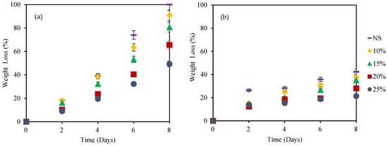 Figure 1 shows the weight loss of NS and S/CNP films after each soil burial interval (2, 4, 6, and 8 days) in two soil types: (a) compost soil, and (b) planting soil. It can be observed that all of the films experienced weight loss during the SBT period. This was due to the hydrophilic nature of the starch, which tended to absorb water [], and the water was used by microbes in soils to thrive and release hydrolytic enzymes to break down biopolymers []. It can also be seen that the weight losses of S/CNP films were generally lower than NS films in the compost and planting soils due to the existence of CNP.