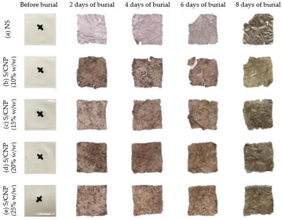 Comparing the visual appearances of NS and S/CNP films in compost soil and planting soil, rapid degradation of the sample films in compost soil (Figure 2) was observed after 6 days compared to degradation in planting soil (Figure 3). Higher weight loss and a more significant appearance change indicated a higher degradation rate. Compost soil has higher humidity, which could increase the water absorption rate from the soil into the films. As a result, the absorbed water facilitated the microbial digestion of film, causing a fracture or changes in physical properties such as color and size [].