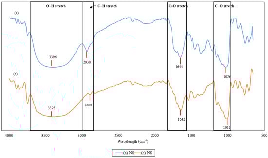 After the SBT in planting soil, the peak of the O-H groups of NS film (Figure 5c) from 2900 to 3700 cm−1 was found to be broader compared to NS film before SBT (Figure 5a). This indicates the existence of a higher amount of OH groups that could easily vibrate, which is possibly produced by the hydrolysis of starch []. The absorption peak intensity of the C-H group of NS film after SBT in planting soil (Figure 5c) reduced, indicating the fracture of the starch chain in the soil []. The intensity of the absorption peak of the C=O group of NS film also decreased, and the C-O stretching vibration absorption band of NS film shifted from 1026 to 1016 cm−1 after SBT in planting soil (Figure 5c). The changes in the intensity at absorption peaks and the shifting wavelength of O-H, C-H, C=O, and C-O groups indicated that the degradation process had indeed occurred. These results were consistent with the finding by Zain et al. [], where there were changes in functional groups, such as the emergence of new peaks and changes in the absorption peaks of the thermoplastic starch polymer matrix after 30 days of degradation, which indicated that the films were degraded. In this study, there were only small changes in the absorption peaks of the NS film that was undergoing degradation in the planting soil, demonstrating that NS films degraded slowly in the planting soil as compared to the NS film before SBT.