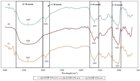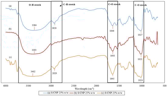 With the addition of CNP to the starch films, the peaks observed from NS film before SBT had displacements where the peaks at 1026 of the C-O group, 1644 of the C=O group, 2930 of the C-H group, and 3396 cm−1 of the O-H group (Figure 5a) shifted slightly to other wavenumbers (Figure 6a and Figure 7a). These changes confirmed the possible interaction between CNP and the film components. This result was in accordance with the work of Hosseini et al. [], where the incorporation of magnesium oxide nanoparticles to the pure modified starch films caused the peaks of the films to be shifted or removed to other wavenumbers. Furthermore, the absorption band of the O-H group of NS film in Figure 5a moved to a lower wavenumber from 3396 cm−1 to 3387 cm−1 for S/CNP 15% w/w (Figure 6a) and 3384 cm−1 for S/CNP 25% w/w (Figure 7a). These shifts in wavelengths confirmed the bond formation between the O-H group of starch and CNP.