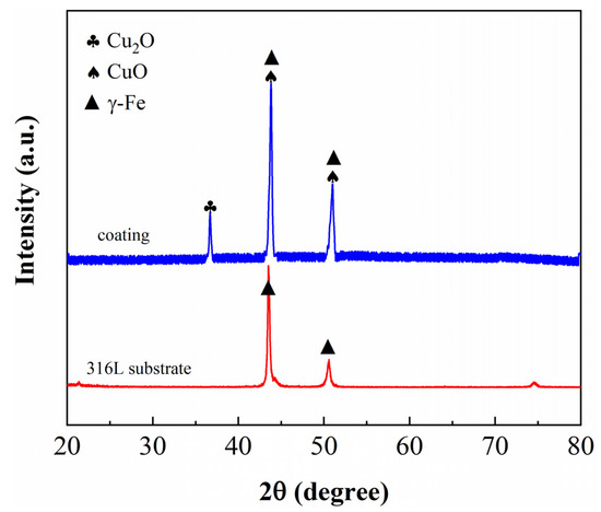 The XRD spectra of NPSS and Cu/NPSS are illustrated in Figure 2. The crystal structure of NPSS exhibited the major diffraction peaks at ca. 44° and 51°, which corresponded to austenite phase. The Cu/NPSS crystal structure is mostly composed of the austenite phase, which contains CuO, and Cu2O. Here, the Cu2O phase that was obtained agrees with previous report [18].