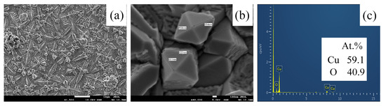 SEM and EDX were used to analyze the surface morphology of the Cu/NPSS (Figure 4). The surface of NPSS was covered in dendritic crystals. These morphologies do indeed resemble those that have already been reported [19,20,21]. The typical copper dendritic formations’ mechanism was explained using the diffusion-limited aggregation (DLA) hypothesis. This is thus because copper deposits that resemble DLA are frequently found in polycrystalline copper branches. This result indicates that the nanopore structure SS significantly improves the electrodeposition of dendrite copper films due to versatile porous structure and high active surface area. Such a flower-like Cu film-coated nanoporous stainless steel has an excellent membrane base binding strength. This is due to the fact that nanopore structures improve the capacity for atom absorption and interaction. It was clear from the EDX and XRD data of Cu/NPSS in Figure 2 and Figure 4 that an electrodeposited copper oxide coating had formed on the surface of 316L NPSS.
