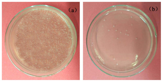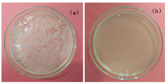 E. coli bacterial colonies on different samples after a 12 h incubation. (a) NPSS, (b) Cu/NPSS.