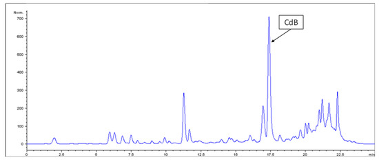 CdB quantification was performed on an Agilent Technologies 1100 series (Waldbronn, Germany) HPLC system equipped with an Agilent G1321A fluorescence detector, controlled by the ChemStation. An X-Terra C18 column (150 mm × 3.0 mm, 3.5 µm) from Waters (Milford, MA, USA) was used. The mobile phase consisted of (A) water and (B) ACN. The gradient employed was: 0–0.35 min, 25% B; 0.35–5.8 min, 25–45% B; 5.8–15.5 min, 45–70% B; 15.5–18.4 min, 70–100% B; 18.4–20.5 min, 100% B; 20.5–22 min, 25% B. A constant flow rate of 0.55 mL/min was used and the injection volume was 20 µL. Fluorescence detection was carried out using the wavelength of 227 nm as excitation and 313 nm as emission.