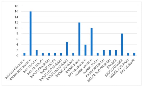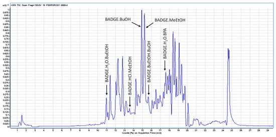 The BADGE derivative with the highest incidence was BADGE.H2O.BuEtOH, which was presented in sixteen of the twenty samples analysed; followed by BADGE.BuOH, BADGE.MeEtOH and BADGE.H2O.BPA (Figure 4). These results are in line with others published in the literature [4,5,6,7,8]. However, the bibliography reviewed by the authors revealed that these compounds were only identified in migration tests carried out on cans with solvents. The closest study to the present one would be that reported by Theobald et al. [5], where sunflower oil was used as a simulant for the identification of these compounds. Therefore, to date, this would be the first work where these BADGE derivatives are tentatively identified in real food samples.