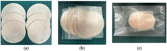 The sliced chicken sausage (a) “0” samples; (b) “0” samples separated with spacers; (c) the samples inside the package before storage.