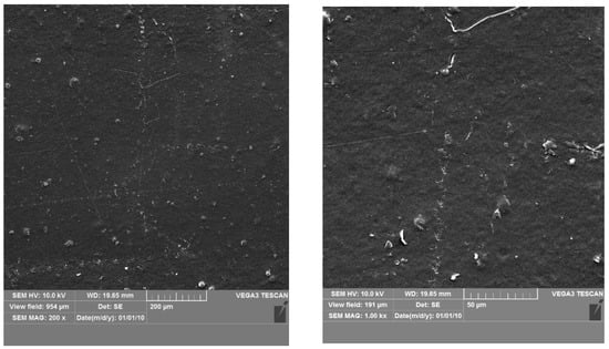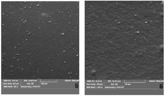 The PE foil and PE covered with the active coatings M1 and M2 were analysed using a scanning electron microscope (SEM). A microscopic analysis was performed using a Vega 3 LMU microscope (Tescan, Brno-Kohoutovice, Czech Republic). The tests were important to determine if the PE foils were thoroughly and homogenously covered with active coatings. An analysis was carried out at 25 °C with a tungsten filament and an accelerating voltage of 10 kV was used to capture SEM images for both the non-covered and covered PE foil samples. All specimens were viewed from above.
