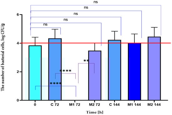 The total count of mesophilic bacteria. ANOVA: ns—not significant; ****—p < 0.0001; **—p < 0.01.