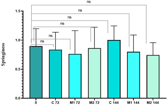The results of the work showed that the springiness of the sliced chicken sausage decreased after 72 h of storage in uncoated PE films. After 144 h, this parameter increased. A modification of the bags with an active coating containing the m1 mixture as an active agent caused a greater decrease in springiness of the sliced chicken sausage after 72 h of storage compared to the uncoated bags. It was noted that after 144 h of storage, the chicken sausage samples in bags coated with the M1 layer caused a lower increase in springiness than when compared to the uncovered bags (Figure 6). Analysing the samples which were coated with the M2 layer, it was seen that springiness decreased after 72 h of storage. The greatest decrease in springiness was noted after 144 h of storage. The differences between springiness values were noticed to not be significant and this was confirmed by statistical analysis (p > 0.05).
