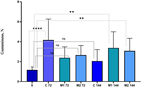 The gumminess of the sliced chicken sausage. ANOVA: ns—not significant; ****—p < 0.0001; **—p < 0.01.