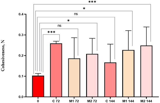 The cohesiveness of the sliced chicken sausage. ANOVA: ns—not significant; ***—p < 0.001; *—p < 0.05.