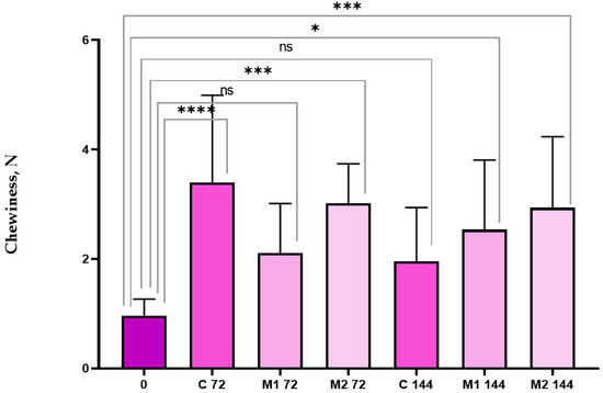 The chewiness of the sliced chicken sausage. ANOVA: ns—not significant; ****—p < 0.0001; ***—p < 0.001; *—p < 0.05.