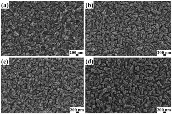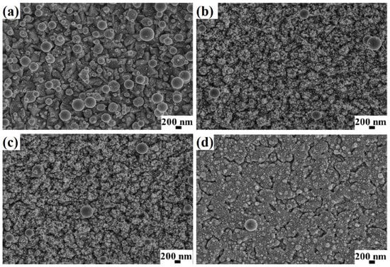 Figure 2 shows SEM microscopies of the 17.6-nm-thick Pd film on the FTO surface after laser irradiation at fluence values of 0.5 J/cm2 (a), 0.75 J/cm2 (b), 1.0 J/cm2 (c) and 1.5 J/cm2 (d). Similarly, Figure 3 shows representative SEM images of the 48.6-nm-thick Au-Pd film on the FTO surface followed by laser treatment at fluence values of 0.5 J/cm2 (a), 0.75 J/cm2 (b), 1.0 J/cm2 (c) and 1.5 J/cm2 (d). In general, metal thin films such as Au and Pd de-wet from the substrate surface during nanosecond-pulsed laser irradiations. The irradiations result in the metallic films melting, followed by holes being formed in the films (reaching the substrate surface) and films retreating away from the holes towards the formation of droplets of a circular section. At the higher fluence values, the vaporization and recondensation of the droplets can also occur [24,25].