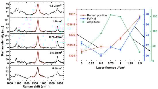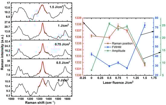 On the (left): Raman spectra taken from different areas of Pd with a thickness 17.6 nm irradiated with various laser fluence values (0 J/cm2, 0.5 J/cm2, 0.75 J/cm2, 1 J/cm2, 1.5 J/cm2), the peak located at 1340 cm−1 adjusted with a Lorentzian function (red curve); on the (right): extracted parameters (Amplitude, Raman peak position, FWHM) from the adjustment with the Lorentzian function versus laser fluence.
