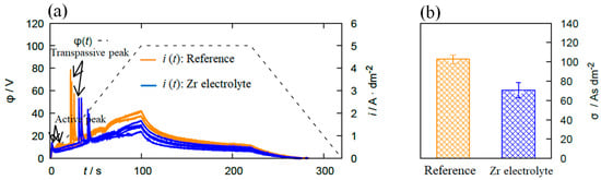 The i(t) curve can be divided into the three regions “active”, “passive”, and “transpassive” based on a model proposed by Krysmann and Kurze [10]. First, an ion-conducting oxide layer is formed on the substrate by the anodic polarization and results in a sharp peak called “active peak” in the i(t) curve. The oxide layer thickens and this appears as a low-slope region indicating a “passive region” in the plot. Continuously increasing voltage allows for the evolution of oxygen molecules on the anode, leading to a sharp increase in the current density (“transpassive region”). As seen in Figure 1a, the addition of Zr-based salt into the bath extends the passive region of the substrate, indicating the positive effect on the passivability of the substrate. This is confirmed by the σ-value, which is (103 ± 5) As/dm² for the reference electrolyte and (71 ± 8) As/dm² for the Zr containing solution. Lower σ-values correspond to a better passivation.