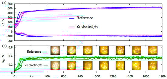 Figure 2b shows the maximum photovoltage as well as single frames of the video recordings placed to the corresponding process stage. Both the voltage envelopes and the course of the photovoltage show good reproducibility for the individual experimental repetitions within the same electrolyte. A direct comparison of the electrical, photoelectrical and optical process data between the experiments in the two different electrolytes additionally shows that there are no major differences in the process behavior. Only the process initiation is delayed by a few seconds in the Zr electrolyte, which should result in generally similar coatings. Thus, in principle, the produced sample material is suitable for direct comparisons with regard to mechanical characterizations.