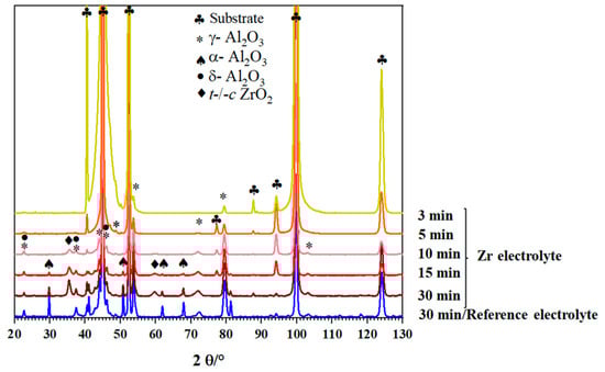 Figure 3 shows the XRD diagrams of the PEO coatings produced under alternating-current (AC) mode in the Zr electrolyte for different process times. For comparison, the diffraction diagram of the reference coating is also shown.