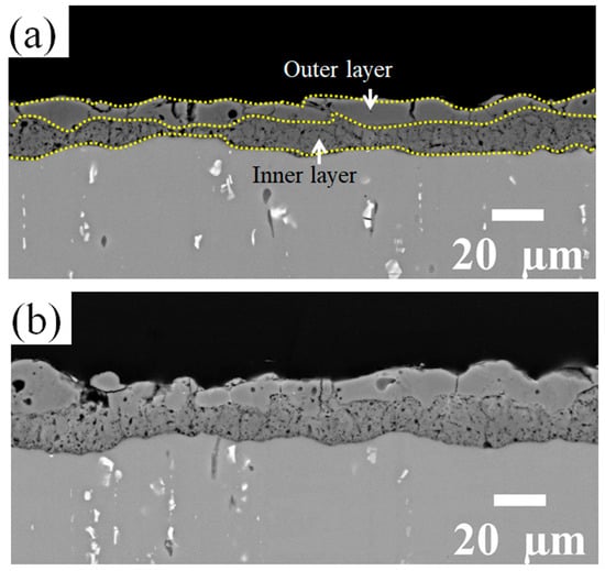 BSD cross-section images of (a) the reference coating and (b) the coating prepared in the Zr electrolyte. Both PEO coatings exhibit a two-layered structure with a more compact outer layer.