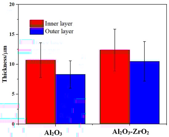 Both coatings have a two-layered structure, which includes a more compact outer layer with vertical cracks, and micro-pores and a finely porous inner layer. However, with the addition of Zr-based salt, the number of vertical cracks in the outer layer is decreased, and they are shallower. The thickness of the layers is presented in Figure 5. The addition of Zr-based salt into the PEO bath increased the thickness of the coating’s outer layer from 10 µm to 12 µm and that of the inner layer from 8 µm to 11 µm when using identical parameters in the PEO process.