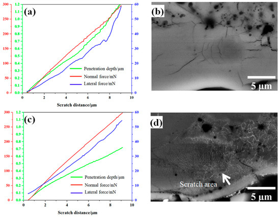 Nano-scratch results and BDS images of one representative scratch on the Al2O3 reference coating (a,b) and the Al2O3-ZrO2 coating (c,d).