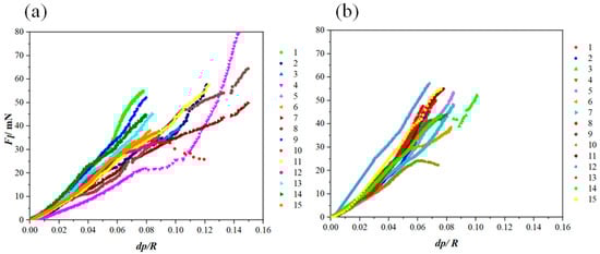 Based on Equation (4), Kc can be calculated through the linear fitting of the Fl (dp/R) curve. The results are presented in Figure 8. According to the linear behavior of the lateral force vs. (dp/R), an appropriate fitting range for each scratch was determined. It has to be noted that the data under small and large loads should be discarded in the curve Fl (dp/R). Under small loads, elastic–plastic deformation occurs, and the cracking plane is not well-developed. When subjected to large loads, the coating failure becomes severe and the cracking behavior becomes complex, thereby rendering the assumption of a semi-circular plane invalid. [24].