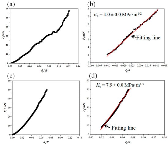 where the units for Fl, Kc and dp are mN, MPa∙m1/2, and µm, respectively. Based on Equation (4), Kc can be calculated through the linear fitting of the Fl–dp/R curve.
