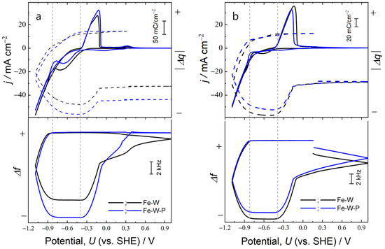 A negative potential scan in the Fe-W and the Fe-W-P baths at pH 3 resulted in a negative current wave at ca. −0.4 V (Figure 1a), which can be interpreted as hydrogen evolution supported by the measured charge density |∆q| [9]. The absence of any frequency change (Δf), i.e., any mass increase, indicates the generation of a gas uncoupled from the surface. With a negative potential of −0.85 V, co-deposition of the alloy components is indicated by a mass and current increase. The phosphotungstic acid contains W in the oxidation state of +6 (comp. WO3). Its reduction to elementary tungsten occurs via the following partial steps [30]: