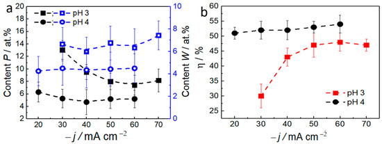 (a) Dependence of the P (black and solid) and W (blue and open) content in Fe-W-P coatings on the electrodeposition current density j at two acidic pH values. (b) Dependence of the current efficiency η on the electrodeposition current density j of the Fe-W-P electrodeposition at two acidic pH values.