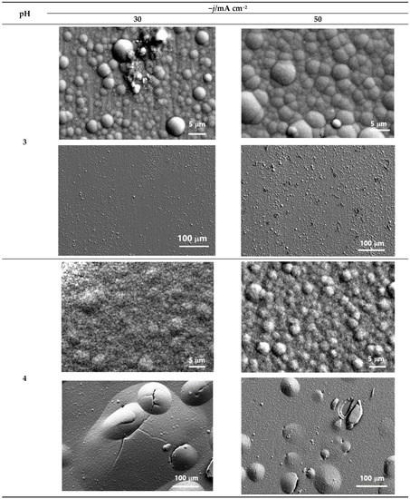 The SEM images of the alloy show the effect of the pH and current density (Figure 3). The observed layer morphology is controlled by the competition between hydrogen bubble evolution, bubble detachment, and the layer growth. pH and j control η [32] (Figure 2b). A low η value indicates a high rate of H+ reduction, a vigorous hydrogen gas evolution, and therefore a fast bubble detachment [34].