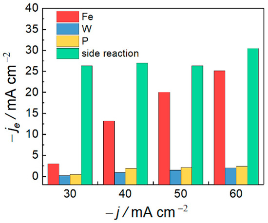 The elements’ partial current distribution, je, of the corresponding element “e”, i.e., Fe, W, and P, were determined at pH 3 (Figure 4). The partial current densities were estimated from the EDX data and the weighed coating mass [11]. je as a function of the overall current density, shows that the current efficiency η of electrodeposition was increasing with j. je of the hydrogen evolution (side reaction) is much less affected by j than all other alloy components [34]. The exceptionally high P content at 30 mA cm−2 and pH3 (Figure 2a) can be understood on the basis of the evaluation in Figure 4. The relative deposition rate of Fe is much lower than that of P and W. At j > 30 mA cm−2, all elements show a practically similar deposition rate increase with j.