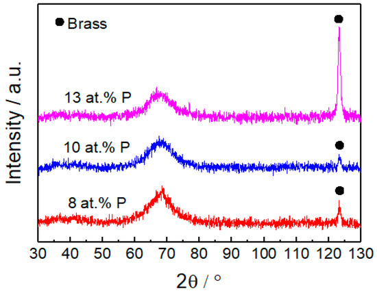 XRD results of the Fe-W-P coatings are presented in Figure 5. The three samples show an amorphous structure, as indicated by the presence of a broad peak from 65° to 75°. This peak appears towards lower angles with respect to the 2θ (110) reflection characteristic of bcc-iron (i.e., 68.78°). This is due to the W substitution in the bcc-iron lattice, resulting in an increased lattice parameter [20]. The only visible crystalline peak corresponds to the brass substrate. The varying intensities of the brass peak for the various at.% P are due to the respective coating thicknesses.
