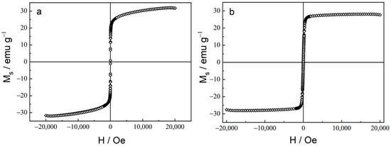 Hysteresis loops of Fe-W-P coatings. (a) 8 at.% P, 6 at.% W; (b) 13 at.% P, 6 at.% W, recorded with an external magnetic field applied along the in-plane direction.