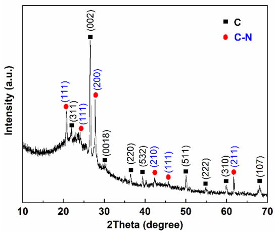 The XRD patterns of the nano-carbon were obtained, as presented in Figure 6, to determine its crystal structure. The XRD pattern in Figure 6 contained a number of peaks in the region of 10°–70°, which were indexed as the diamond (111), graphite (002), (200), and (311) planes of C and C-N. The (002) planes represented the heat treatment at a high temperature, causing the partial graphitization of the material. As indicated by the higher back bottom, the sample contained a small amount of amorphous carbon [36]. These results revealed that the nano-carbon consisted of multiple components (e.g., diamonds and amorphous carbon).